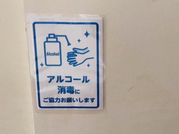 教室中の扉に消毒ステッカーを貼って、健康のための注意喚起を促します。