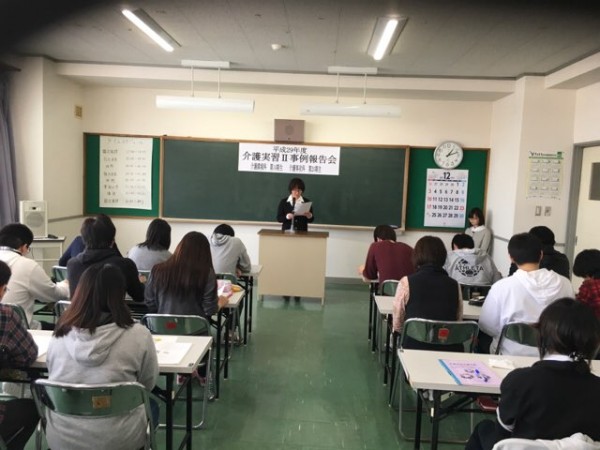 各実習施設でお世話になった指導者の方、介護環境科1年生、本校教員が見守る中、実習の集大成である報告会は終了しました。