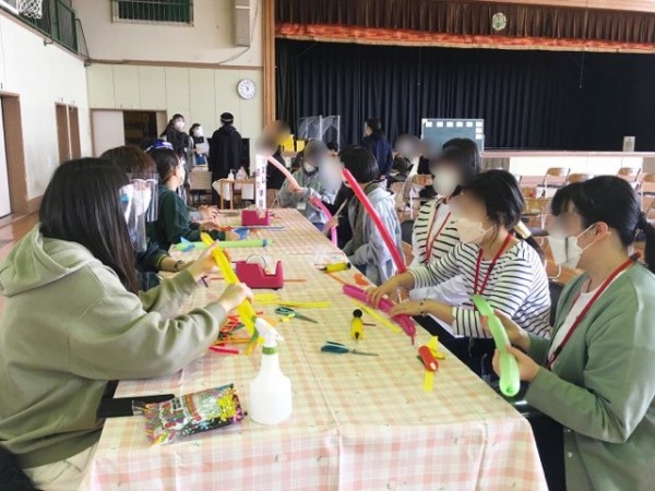 こども環境科は工作体験を2ブース用意してくれました。写真はフーセンロケットのブースです。先輩が優しく丁寧に教えてくれたと大好評でした。先輩が実際の授業で学んだ題材を教えてくれました。。