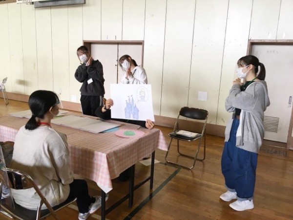 リズム遊びの体験ブースでは、手遊び歌を披露して一緒に行いました。学生たちは実際の保育現場で行う時に、導入として子どもに興味を持ってもらうために用いるペープサートを用意しました。「ディズニーのイラストが上手」とたくさんの褒め言葉をいただきました。