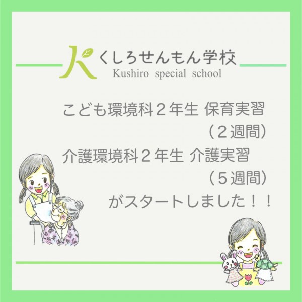 本日より、こども環境科2年生の2週間の保育実習が、介護環境科2年生は5週間の介護実習IIがスタートしました。2年生は学校での学びのほか、1年次で行った実習での経験を活かした実習内容となります。