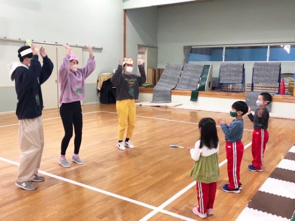 ゼミ員は『身体を動かすことの楽しさを感じてもらう』との目標を立て、準備を進めてきました。先日、近隣の幼稚園で動物リズム歌とポーズ列車の実践の機会をいただきました。