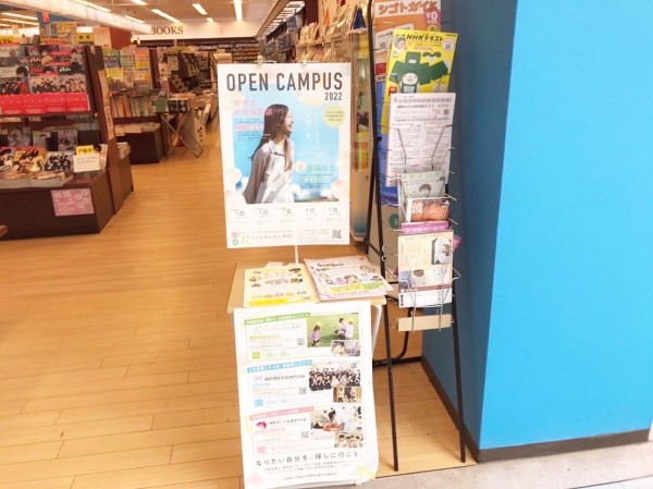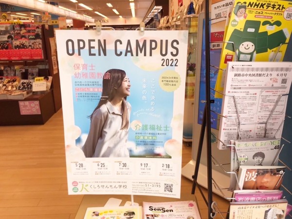 イオン昭和2階にある書店『BOOKsHIROSE』さんの一角にくしろせんもん学校のコーナーが設置されました。コーナーでは学校ポスターの掲示のほか、年間オープンキャンパスチラシと広報誌のセンセンマガジンを自由にお持ちいただけます。