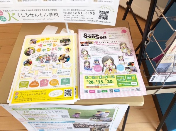 せんもんコーナーでは、フリーペーパーであるオープンキャンパスチラシと広報誌センセンマガジンを自由にお持ち帰りいただけます。今回のテーマは『くしろせんもん学校 キャリア教育への取り組み』です。お家でじっくり読んでみてくださいね!!