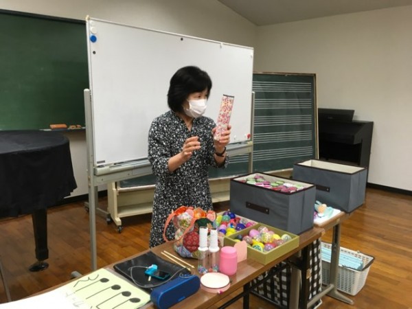 担当は、こども環境科専任講師 音楽アクティビティデレクターの川崎晶子先生です。川崎先生が身近な素材で手作りしたマラカス、カスタネット、タンバリン、鈴などの楽器を紹介しました。