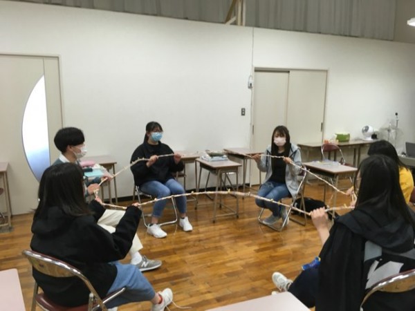後半の授業では、身近な素材を使ったアンサンブルや手作り楽器を用いた遊びを工夫し、模擬保育の形で展開し、実習に向けての準備を行います。