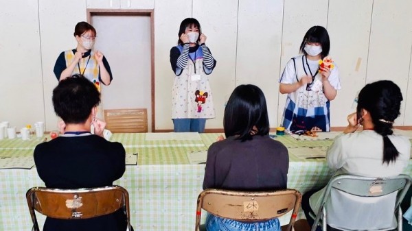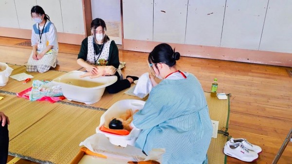 赤ちゃん人形を活用して、エアー沐浴体験を行いました。