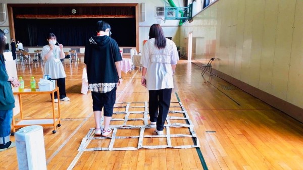 ふまねっとを体験してもらいました。2年生が授業で作成した新聞紙ふまねっと。マス目を踏まない様にゆっくりと運動しました。
