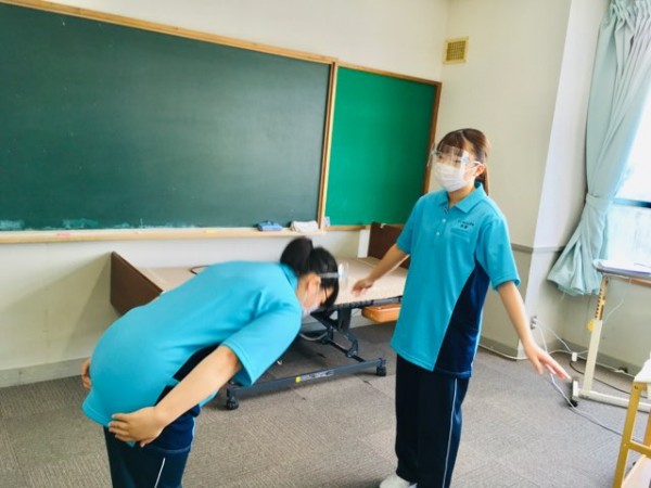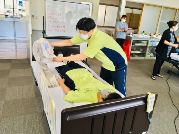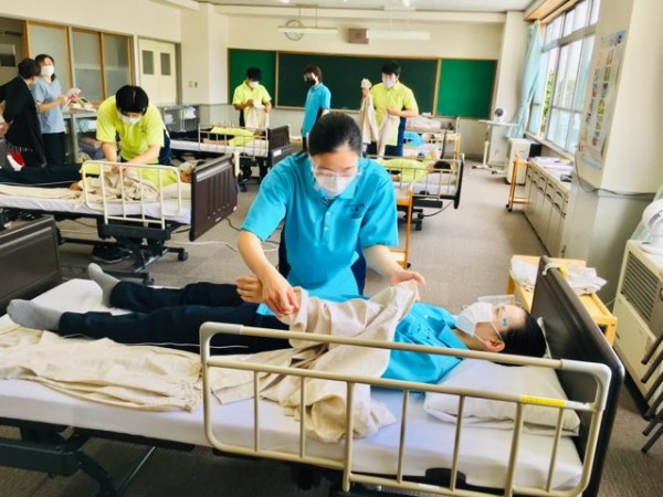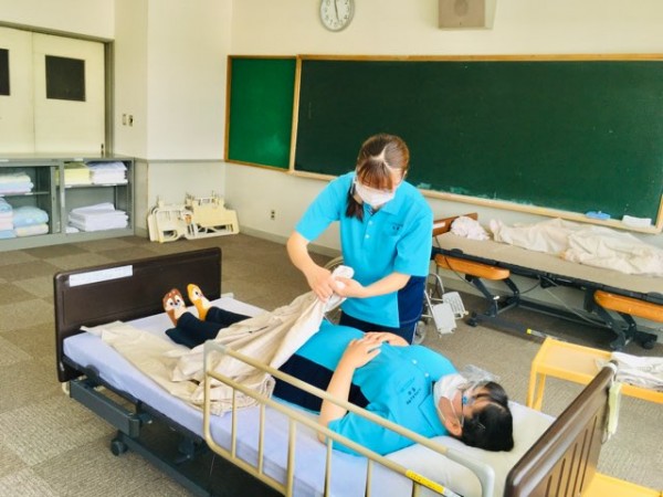 今日紹介するニュースは、生活支援技術II-① 身じたく 着脱(ベッド上での介助)です。11月に予定している4週間の介護実習を視野に、全介助を必要する利用者の方を想定したベッド上での介助を学習しました。着脱は、『*脱健着患』が基本となり、利用者の方にとって、苦痛・負担の少ない対応が求められます。羞恥心や室温にも配慮した介護技術を習得しようと頑張る1年生でした。