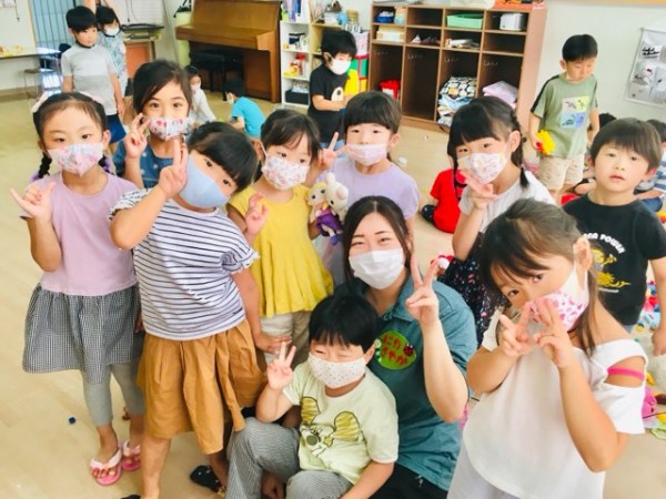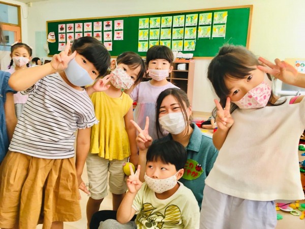 わかばフレンドようちえんでお世話なっている実習生とさくら組のお友達。2週目に入り、子どもたちとも仲良くなって来ていました。