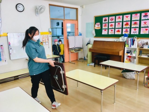 子どもたちが安心・安全に遊べるよう教室の環境(採光・オモチャの点検や消毒、温度設定など)を整えたり、朝の会のためのテーブルセッティングも保育者のお仕事です。