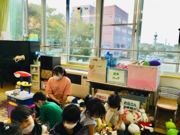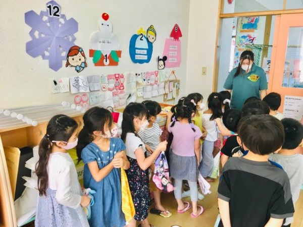 子どもたちが全員揃ったところで、遊んだオモチャをお片付けしました。この日は園の計らいで、朝の会まで見学できました。