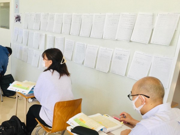 教室の壁に貼り出され学生自らが作成した問題プリント。全員が正解できるまで、掲示は続きます。12日ごとに巡って来る問題作成と、1日1問ずつ新たな問題に向き合う機会が、全員合格への道へとつながってゆきます。