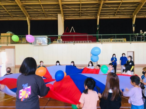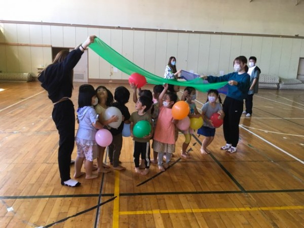 最後はパラシュートで、遊びましょう!揺さぶり遊び、大波遊び、どんどん波が大きくなりますよ。フーセンを落とさないように、頑張れるかな?