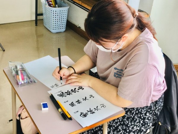 今日は書道アクティビティの最終日。事前に書きたい詩を選定し、自分が納得できるバランスの取れた書にするために、何度も何度も練習しました。