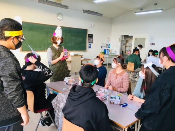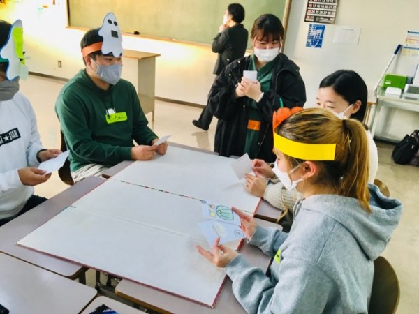 写真中央のお2人は、担当くださる非常勤講師の豊島先生と桂先生です。現場での実践を基に、それぞれの得意分野のアクティビティをご紹介くださり、学生は視野をどんどん広げています。