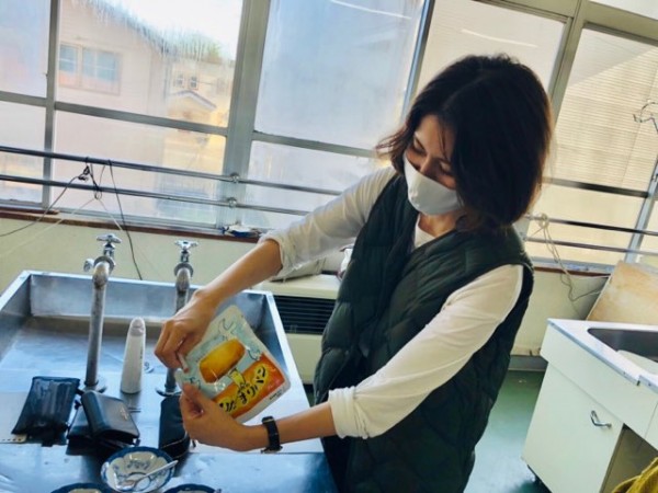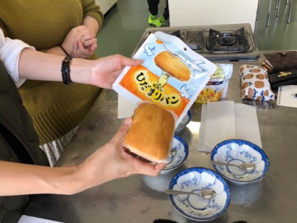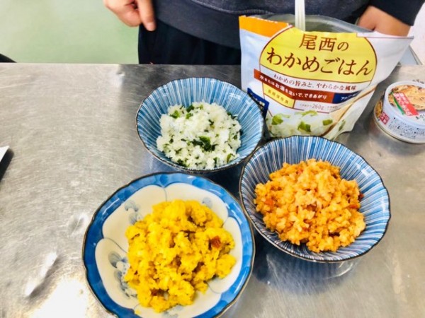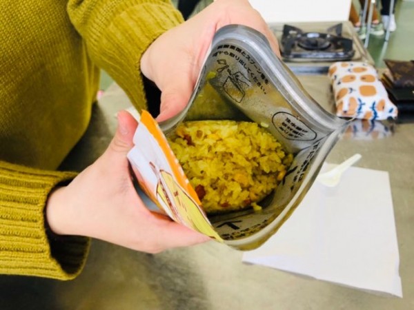 釧路に密着した地域福祉活動を行っている特定非営利法人ワーカーズコープ釧路地域福祉事業所所長の本間千明樹先生(写真中央)が、この日のゲスト講師として、災害時の非常用保存食『アルファ米』をご提供くださりました。本間先生の指導のもと、作る工程も含めた試食を体験しました。
