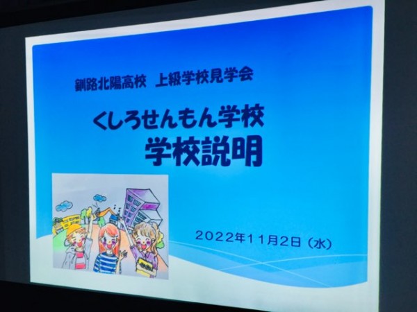 上級学校見学会がスタートしました。オリエンテーションでは、専門学校の一つとして「くしろせんもん学校」がどのような学校なのか、教育理念・資格取得についてや授業内容などを含む「学校概要説明P P」を約20分間聴講しました。