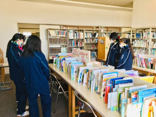 感染対策のため、A・B 2グルーブに分かれて、1階から5階までの専門的設備を配置した教室を見学しました。「3階の図書室には、約7000冊の専門書や600冊の児童書や絵本があり、授業や実習で活用しています」