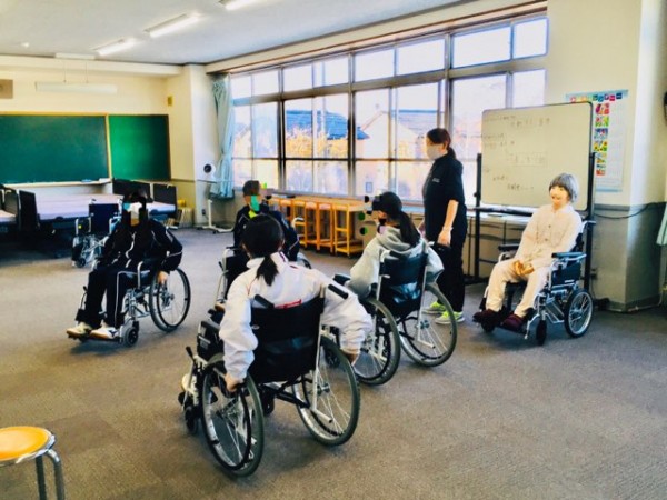 授業体験は、介護・保育の分野ごとに行いました。介護体験は『車いす介助〜安心・安全・安楽への配慮』と題した30分間のミニ授業を体験しました。高齢者の特徴を知り、車いすの構造名称を学習してから、自走・介助を体験しました。