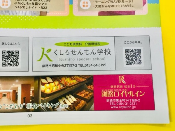 くしろせんもん学校は地元ラジオ曲 F Mくしろのタイムテーブル企画(番組表)のスポンサーです。先日、アナウンサーの今さんが来校し、秋・冬号の録音を行い、新パーソナリティによる『学校コマーシャル』をリニューアルしました。