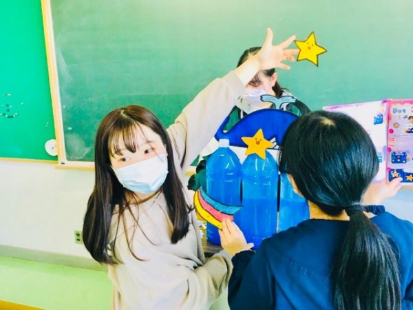 絵を描くことや、ものづくりが苦手な私でしたが、授業の中で製作やシアターづくりを通して、だんだん好きになっていきました。現在は『教職実践演習』という授業で劇遊びに取り組んでいます。今まで学んできたことを活かしながら、自分たちでいろいろな工夫を取り入れて作品づくりに楽しく取り組んでいます。