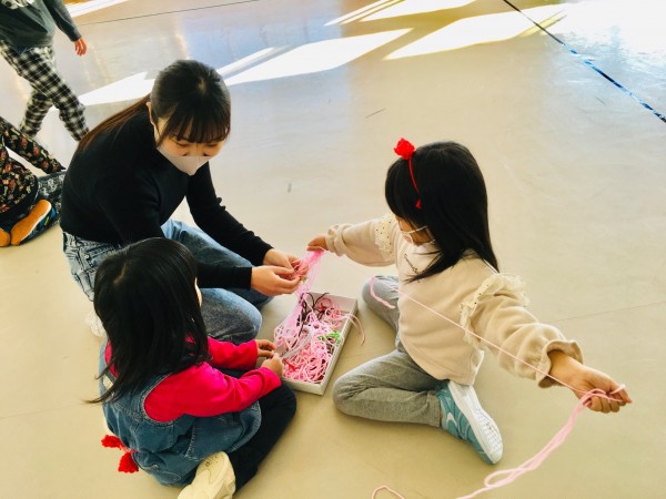 保育内容の指導法(表現)の課題発表の一場面です。わらべうたの発表を仲間と一緒に頑張りました。