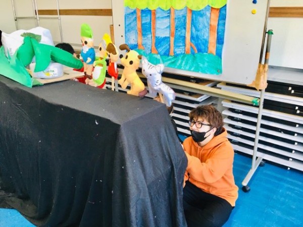 題材選びから始まり、台本作り、人形作り、大道具、小道具、背景と地道な準備を重ね、発表の形にまとめました。どのグループも個性が輝き、それぞれに工夫を凝らした仕掛けがあったりと、子どもたちが楽しめる要素がいっぱいのリハーサルでした。