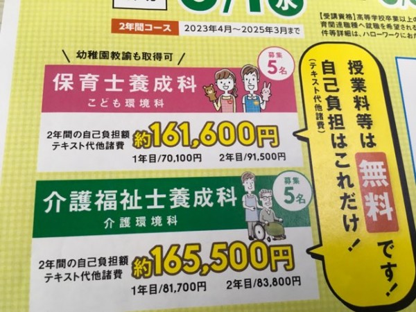 令和5年度は保育士養成科(幼稚園教諭免許も取得可能)、介護福祉士養成科はそれぞれ5名ずつの応募枠です。