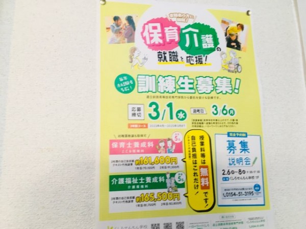 現在、本校のこども環境科と介護環境科には、22名の社会人学生さんが通っています。近年、本校では道立釧路高等技術専門学院の委託訓練生を受け入れています。保育の専門職である『保育士』の資格取得(国家資格)を目指すコースと、介護の専門職である『介護福祉士』の資格取得(国家資格)を目指すコース、それぞれ2年間の訓練コースです。