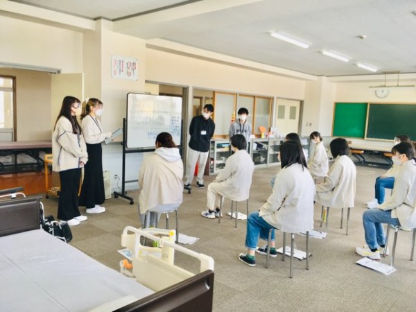 今回のテーマは学生の実践発表。介護環境科の学生たちは、車いす介助と衣服の着脱を中心とした、授業発表を行いました。介護クイズを交えて、楽しく学べてためになる内容でした。