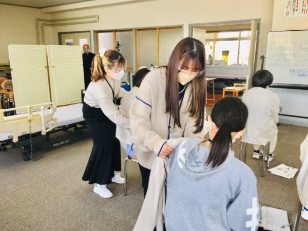片麻痺の設定で、着脱介助の方法を実際に体験してもらった後、先輩の介助を受けることで、心地よい介助の方法を体感することができました!