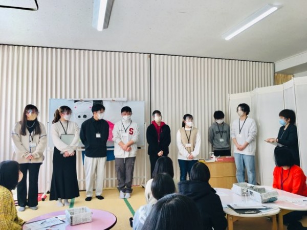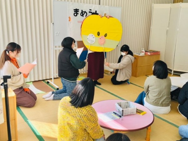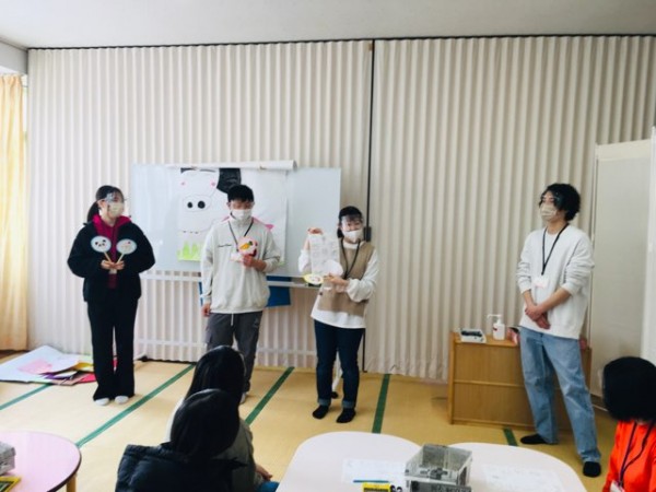 後半のこども環境科は、先日幼稚園で実践した劇遊びを披露してくれました。お話の世界観を伝えるために学生たちが工夫した背景や小道具に、皆さん目を輝かせて観劇してくれました。