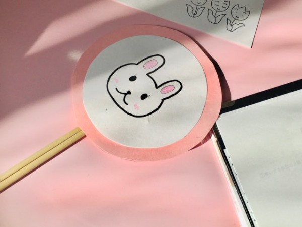 ミニ体験は、簡単ペープサートを作りました。時間の関係で、土台のペープサートは先輩たちが事前に準備して、ピンク・黄色・水色の3色から選んでもらいました。