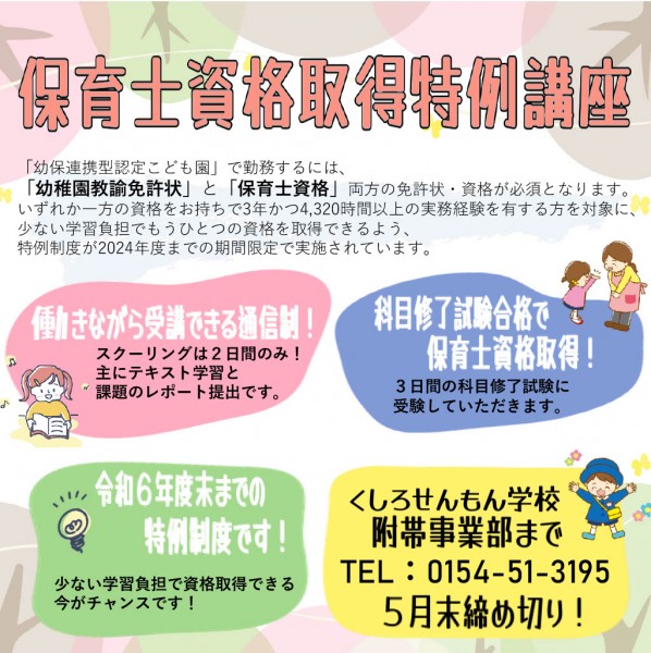 くしろせんもん学校では幼稚園教諭免許を持っていて、保育士資格を持っていない方のための通信課程【保育士資格取得特例講座】を開講しております!