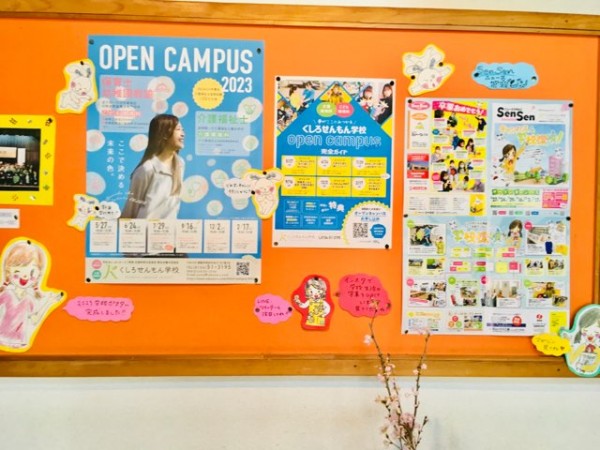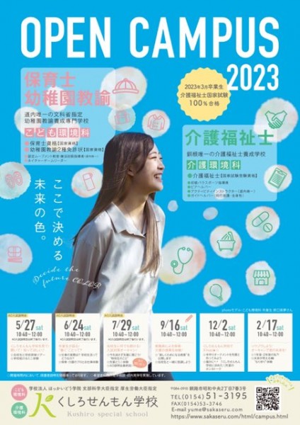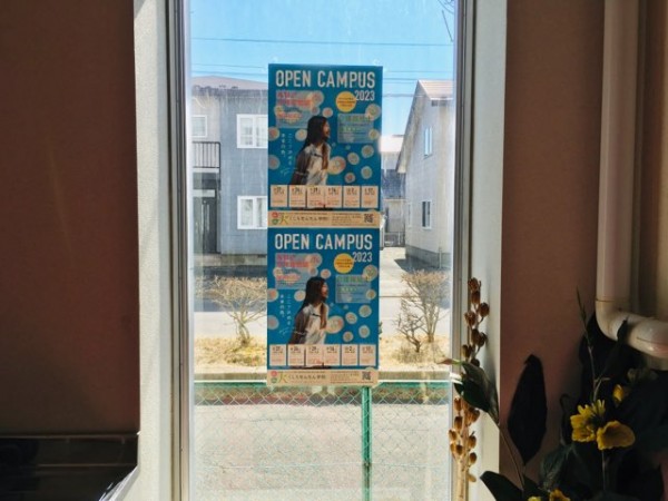 今年、くしろせんもん学校は平和ブルーでオープンキャンパスチラシと学校ポスターを作成しました。この平和ブルーを目印に、街中でも学校ポスターを探してみてください。