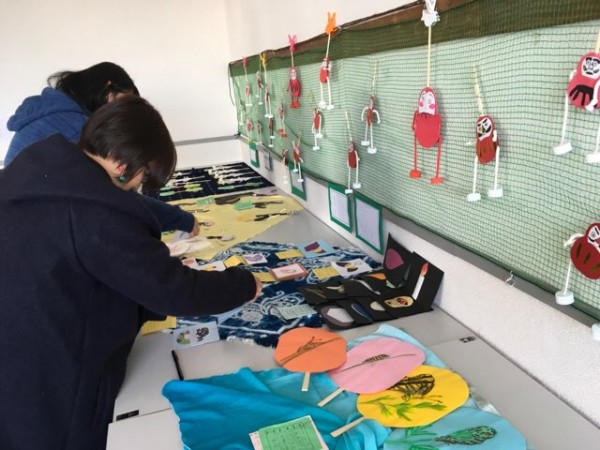 授業で作成した作品を展示する学生。