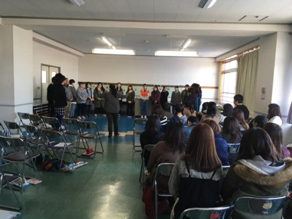 この日はグループに分かれて、学びの成果を1年生に向けて披露しました。「一山超えて、二山超えて、三山目の奥に、火がチンガリ チンガリよ♩」