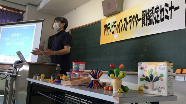 この日のセミナーでは、アクティビティ・ケアの基礎理論や福祉施設における事例を通してアクティビティ・ケアの重要性を学び、工作やアクティビティ・トイを通してコミュニケーションスキルを高める実践を行いました。
