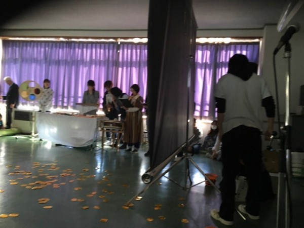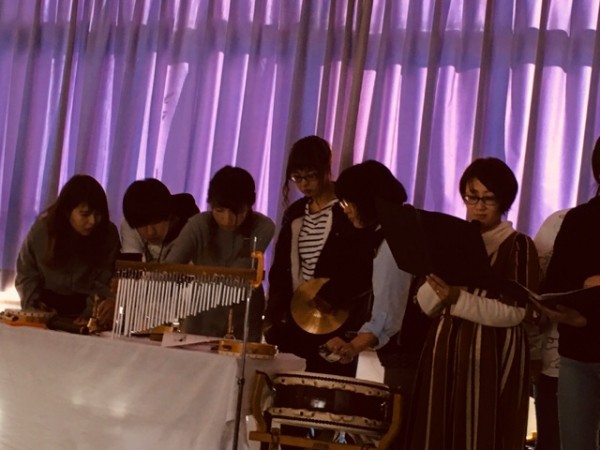 中央のウィンドチャイムはキラキラとした音を奏でる金管楽器。この日のために学生が手造りしました。